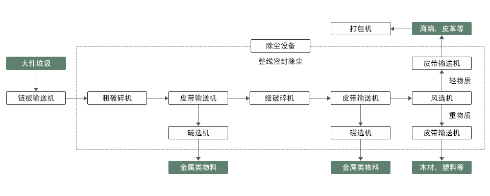 Large pieces of garbage are collected and transported to the large piece of garbage crushing and processing center. The chain conveyor transports the large pieces of garbage to the coarse crusher, crushing them into smaller sized materials. The iron remover sorts out metals such as iron wire and iron sheets, while other materials are transported to the fine crusher for further crushing through the belt conveyor. After crushing, the discharged material is further separated from the iron component through the magnetic separator, and other crushed materials are transported to the air separator through the belt conveyor. The air separator further screens the materials according to their weight, while light substances such as sponge leather are transported to the packaging machine. The entire line system is sealed for dust removal